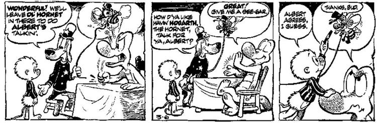 En funny animal-stribe, der integrerer den politiske satiretegning plus al tænkelig typo- og piktografi: De konservative kræfter taler i gotiske bogstaver, bedemandsgribben har sørgerand om taleboblerne, mens en underholdende showbjørn taler med alle de sensationstypografiske unoder, man finder i tilbudsannoncer og på gamle cirkusplakater.