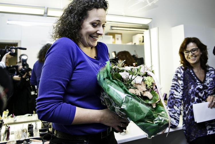 »Du har vundet De Gyldne Laurbær!«, nærmest råber Kenneth Pedersen, mens Anne-Catrine Riebnitzsky springer op af sminkestolen.