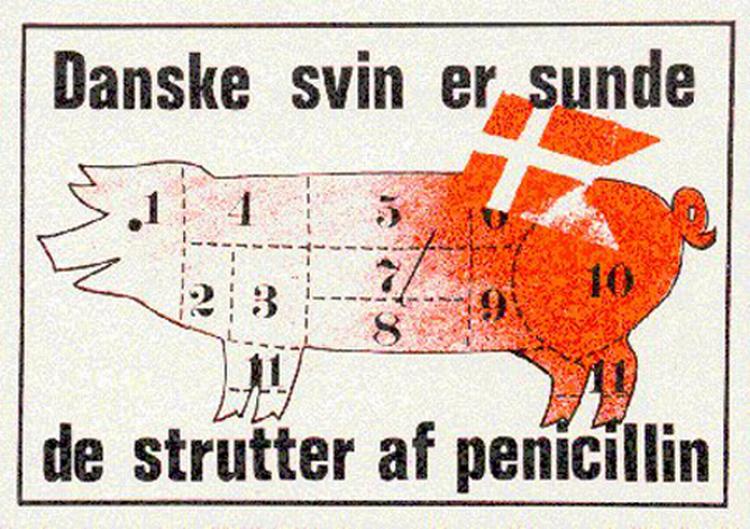 DE DANSKE SVINESLAGTERIER trak tilbage i 70' erne satirikeren Mikael Witte gennem hele retsmaskineriet, fordi han havde formastet sig til at trykke en svineplakat med underteksten ' Danske svin er sunde - de strutter af penicillin'. Witte fik i byretten og senere også i landsretten fogedforbud mod at udgive sit svineri. Men han vandt i Højesteret, dog måtte han ikke udskære sin gris efter svineslagteriernes streger. Så han barberede efter dommen sin ged på en lidt anderledes måde. Underteksten var stadig den samme. Den er stadig lige aktuel.