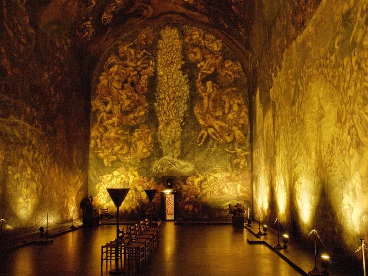 Højt beliggende findes et rødstenshus uden vinduer, en bygning, der mest ligner en mellemting mellem en villa, en kirke og et museum – og sådan set også er noget nær.