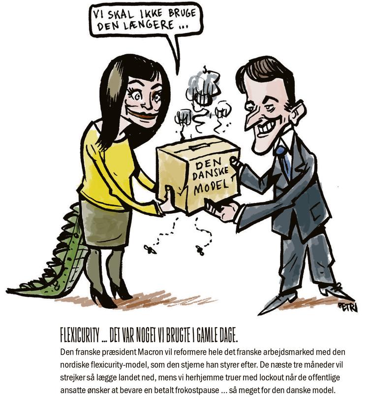 Det er vel mere præcist end egentlig morsomt, når Sophie Løhde i dobbeltrollen som minister og lockout-truende arbejdsgiver roligt kan give ’den danske model’ videre til præsident Macron: »Vi skal ikke bruge den længere ...«.