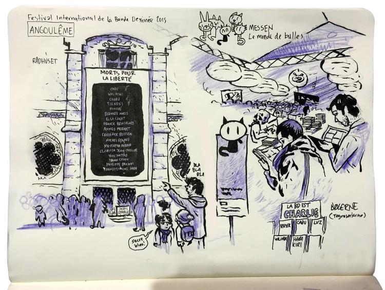 Et kæmpebanner dominerer facadens venstre side: ’Morts pour la liberté’ står der – de døde for friheden – efterfulgt af en liste med navnene på de 16 mennesker, der omkom under angrebet på Charlie Hebdo for et par uger siden, herunder de kendte, elskede og kontroversielle tegnere Cabu, Wolinski, Charb, Tignous og Honoré.
