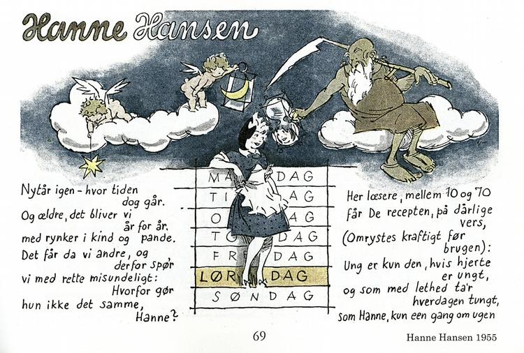 Ja, Hanne Hansen, husassistent, ville have rundet de 80 i år, hvis hun stadig havde slået sine folder her i avisen. Men det havde nok ikke været til at se på hende, for hun var evigt ung, og dét efter en opskrift, der kan læses på ovenstående tegning, i nytårets anledning undtagelsesvis ét stort billede i stedet for enkeltruder på stribe.