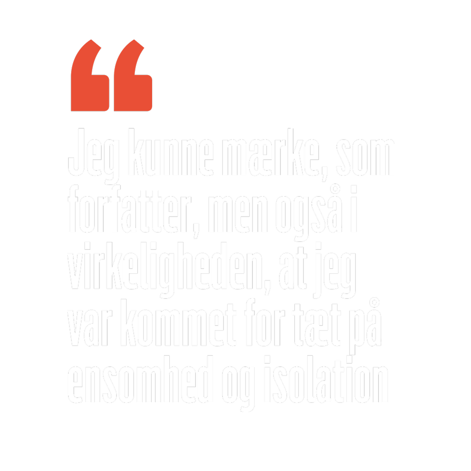 »Jeg kunne mærke, som forfatter, men også i virkeligheden, at jeg var kommet for tæt på ensomhed og isolation. Jeg kunne tydeligt mærke, at der er et undergangspotentiale i det rum, som jeg skulle væk fra«.