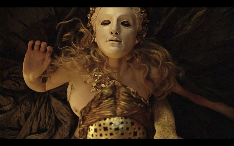 Bag røde forhæng indleder han med hende et svulstigt samleje. Begge hengiver sig fuldt ud til hinanden med maske på, mens vi ved, at de er fjender. Sexscenen eskalerer i tempo og intensitet med heftig kormusik til sit klimaks, da forhænget brat rives til side. De afsløres, også for hinanden. Ydmyges.