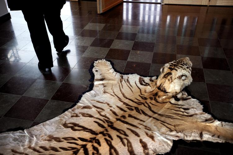 Selv i garagen med tre sportsvogne i henholdsvis rød, gul og koksgrå bliver bagvæggen prydet af en stor Kvium i lyserød og lilla, hvor ansigtsløse personer ligger på række med udspilede maver.