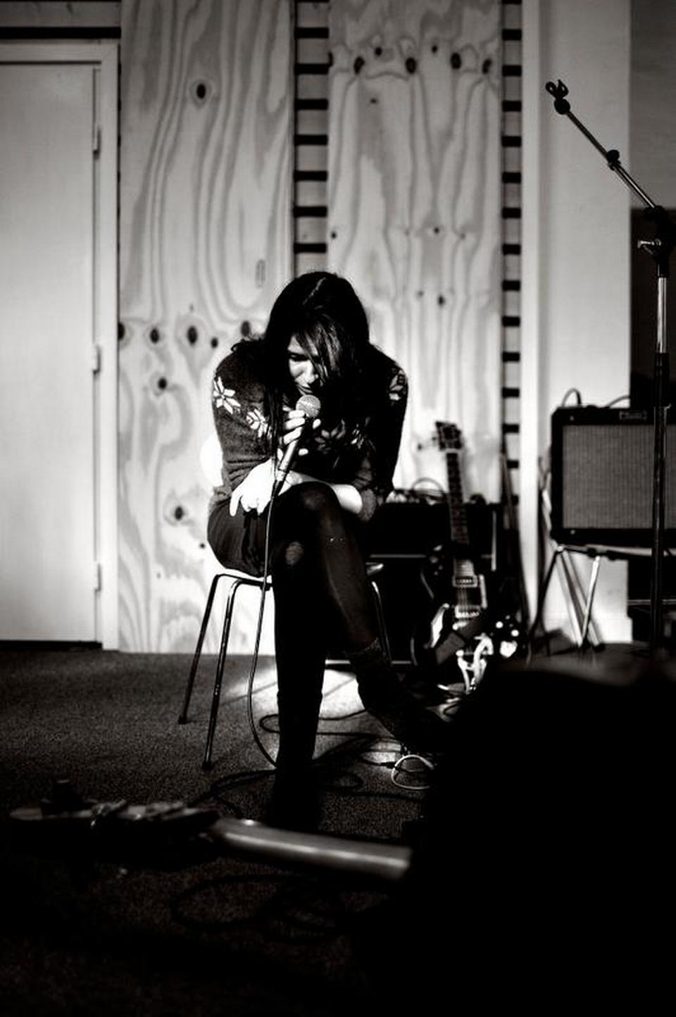 Hendes bare fødder snor sig rundt om stolebenene, mens hun synger. Hendes arm danser med. Tæerne holder om mikrofonstativet. Fingrene piller ved ledningen. Hun ser rundt på de andre, der sætter ind. Sangen stiger, og stemmen tager mere fat.