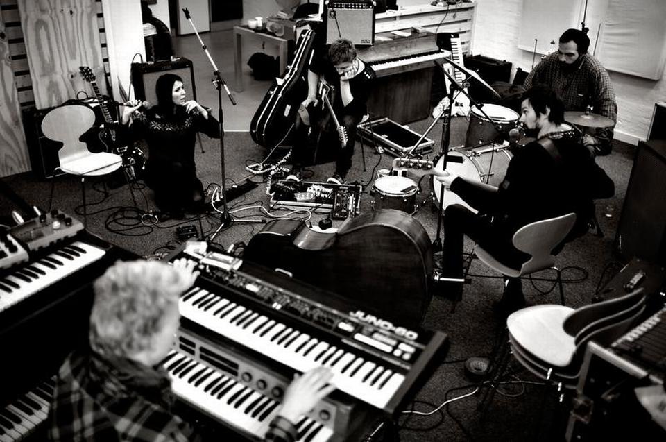 Bandet indspiller i STC-studiet i Nordvestkvarteret. Kira Skov har ikke sin elektriske guitar med.