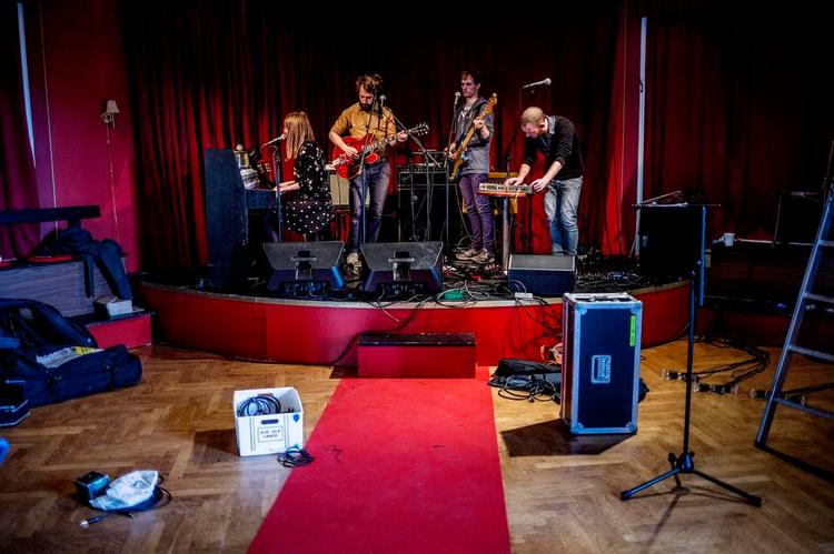 Så slutter sangen. Men foruden lyden af et tilfreds barn i et andet rum er der stille i salen. Ingen klapper. For her er ingen andre end de fire på scenen, en knappeskruende lydmand og en trappestige, der bare står og passer sig selv.