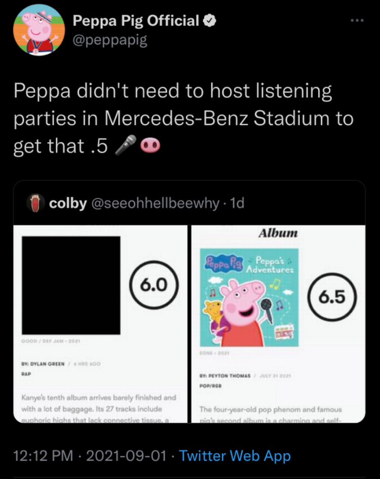 I tweetet, der nu er slettet, har Gurli Gris (eller hvem, der nu styrer hendes Twitter) lagt et billede op af henholdsvis ’Donda’ og ’Peppa’s Adventures’ og den karakter, pladerne har fået af det respekterede musiksite Pitchfork.