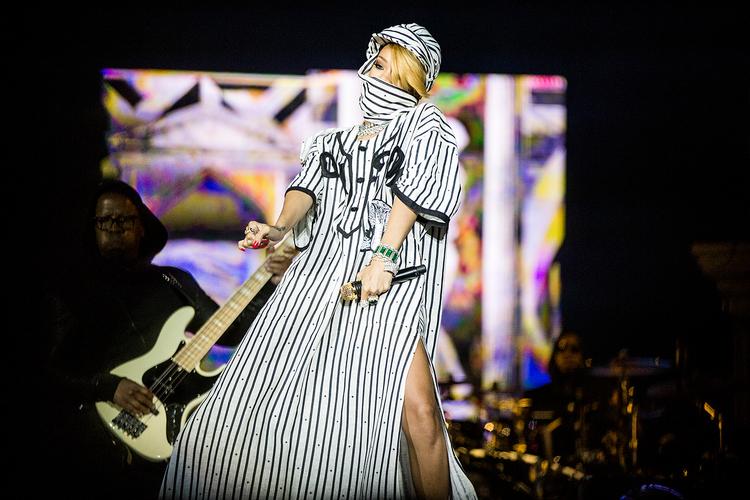 Iført en gulvlang hvid baseball-møder-beduin-kjortel med sorte striber og påskriften POISON, komplet med tilhørende bredskygget turbankasket dansede hun overvejende ukoreograferet og gyngende med duvende gummiknæ, fingerede greb i skridtet og blonderede lokker.