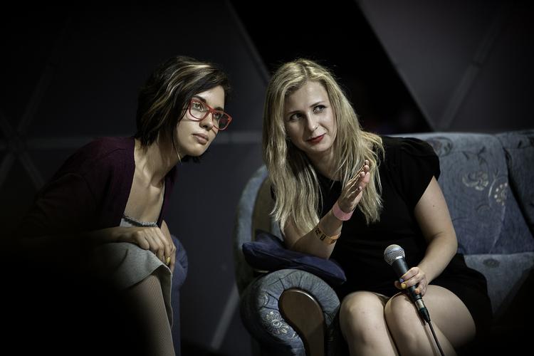 De to punkaktivister er i Danmark - blandt andet for at besøge Roskilde Festival - og sad afslappet, men med alvorlig mine på scenen og svarede på spørgsmål fra den tidligere Rusland-korrespondent i Danmarks Radio, Jon Kaldan.