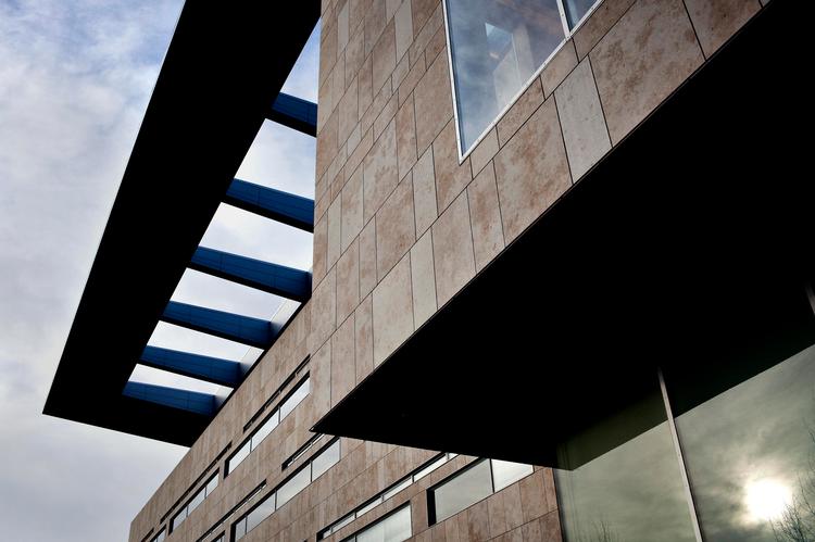 Fredag ved middagstid driver blygrå skyer hurtigt over Operaens flade tag og scenetårnets firkantede kasse.