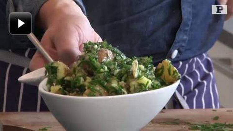 Stamp kartoflerne med et piskeris og rør det godt sammen med urter og smør og smag til med salt og peber.