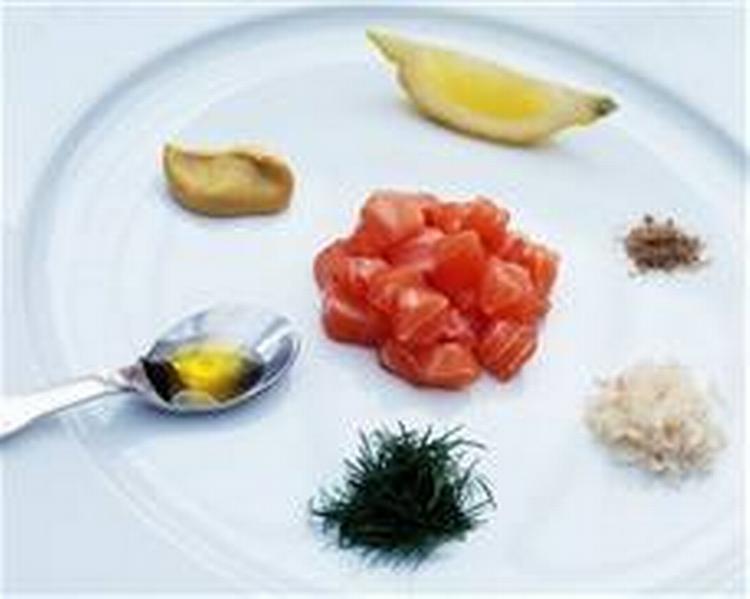 Tag kødet og skær det ud med en meget stor, superskarp og tung kniv for at undgå, at du flosser kødet i stedet for at lave små skarpe terninger. Terningerne skal være uden det mindste brune fedt, som sidder på midten af laksefileterne helt inde ved skindet, da dette smager fedtet og pløret. De rå terninger røres med olie, citronsaft og sennep. Krydr derpå med havsalt og friskkværnet peber. Skalotteløget hakkes ultrafint, dump det så i sammen med plukket og fintskåret dild. Server straks tataren med cremefraiche, ekstra citron, skalotteløg og nogle ristede skiver brød. OBS: Du kan også lave tatar af torskekød, tun eller havtaske. Køkkenfif: I de lidt ældre dage, hvor tataren havde sin storhedstid, svingede man også en æggeblomme eller to i for at giver den lidt mere fylde og cremethed. Men efter at man har haft en helt del problemer med rå æggeblommer, er det ligesom gledet ud af systemet i det moderne køkken. Lidt synd, for det smager himmelsk.