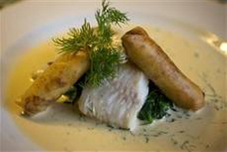 Sådan gør du Pil rejerne, og gem skallerne. Hak rejerne groft. Rens porrerne, og skær den hvide del i tynde ringe. Gem porretoppen.Sautér porreringene i en klat smør, til de er bløde, og tilsæt de hakkede rejer samt en spsk. finthakket dild. Smag blandingen til med salt og peber, og lad den køle af. Rist rejeskallerne hårdt på en varm pande i lidt olie. Tilsæt skalotteløg, hvidløg og blegselleri, alt hakket temmelig fint. Lad grøntsagerne stege med et øjeblik, og tilsæt så hvidvin og fiskefond. Lad det koge i 20-25 min. og si. Kom fløden ved, og lad sovsen koge ind til passende konsistens. Smag til med salt og peber. Bruges der thairullesvøb, følges beskrivelsen på pakken. Hvis der bruges filodej, skæres denne til i stykker på cirka 10 x 10 cm. Læg to blade filodej oven på hinanden, og kom en skefuld af rejeblandingen på. Rul dejen fast om fyldet som en lille forårsrulle. Gentag processen, så der bliver to ruller per kuvert. Kom torskestykkerne i et smurt ildfast fad, salt dem, og læg et smurt stykke bagepapir ovenpå. Bag torsken i ovnen ved 200 grader i cirka 10 minutter, eller til den lige er fast. Rist de små ruller i olie, til de er gyldne og sprøde. Vend den rensede spinat i en varm gryde med lidt smør, til den lige akkurat falder sammen. Smag til med salt og peber. Kom en skefuld spinat på hver tallerken og oven på dette et stykke torsk. Garner med rejerullerne. Blend den varme sovs med dild, og hæld den rundt om.