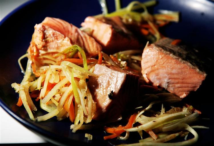 Kombinationen af frisk og lidt fed ørred samt letdampede grøntsager, der både smager lidt hot og meget aromatisk, er himmelsk.
