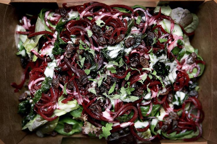 Rødbederne skrælles og skæres ud på en såkaldt turning slicer, for det visuelle udtryk, ellers skives de tyndt. Lægges i isvand. Marineres i hindbæreddike og olivenolie et kvarters tid, så sprødheden bevares.