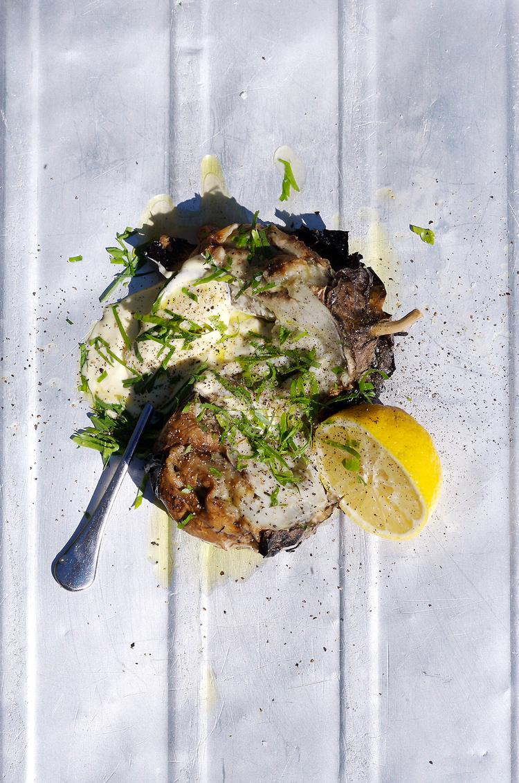 Sådan gør du Læg auberginerne direkte i de varme grillkul. Lad dem ligge, til de er helt bløde, sorte og krakelerede. Flæk dem og spis kødet fra skallen med de øvrige ting over. Servér retten som tilbehør eller selvstændig ret.