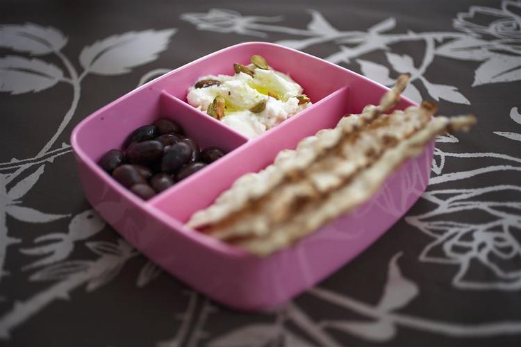 Serveres med fladbrød og oliven.