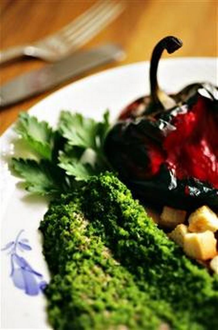 Puds kødet af. Lad vinen koge ved svag varme i 3 minutter. Tag 1 glas fra og gem det til senere. Hæld de resterende 2 glas op i en skål sammen med laurbærbladene, salt og peber. Mariner derefter kødet i blandingen i 30 minutter. Vend kødet fra tid til anden. Tag kødet op af marinaden, lad det dryppe af, og tør det grundigt. Gem marinaden. Varm olien eller smørret op i en stegegryde og brun kødet i 5 minutter. Vend kødet, men undgå at stikke hul i det, indtil der har dannet sig en fast skorpe hele vejen rundt. Hæld derefter marinaden over kødet og fyld op med bouillon eller kogende vand, indtil kødet er lige akkurat dækket. Kog kødet ved svag varme under låg i halvanden time. Tilsæt en lille smule bouillon (eller kogende vand), hvis kødet begynder at koge tørt. Tag nu kødet op og hold det varmt, mens fonden koges ind, indtil der kun er et glas tilbage. Befri imens de 2 peberfrugter for kerner og hvide skillevægge og skyl persillen. Blend peberfrugterne og persillen sammen med det sidste glas afkogt vin. Tilsæt fonden og smag til med salt og peber. Skær kødet i skiver, anret skiverne på et fad og hæld peberfrugtsaucen over dem. Dæk fadet med plastikfilm og lad det hvile i køleskabet i 24 timer. Denne ret kan også tilberedes i en trykkoger. I så fald skal den koges under tryk i 30 minutter og derefter koge videre uden låg, indtil fonden er kogt ind. Serveres med croutoner af ristet brød.