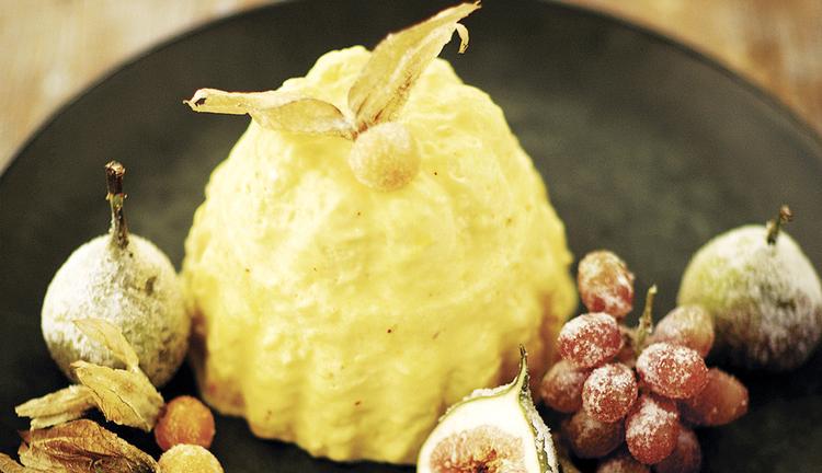 Bring ris, vand og smør i kog i en tykbundet kasserolle. Lad det småkoge i 10 minutter. Del vaniljestangen, og skrab kornene ud. Kom vaniljekornene ned i gryden sammen med stangen og mælken. Lad det simre langsomt, til det danner en tyk grød. Køl grøden af. Bring sukker og vand i kog, og køl lagen af bagefter. Dyp bær og frugt i lagen, og vend dem derefter i sukker. Lad dem tørre på en rist eller et stykke bagepapir. Læg husblassen i blød. Pisk æggeblommer og sukker hvidt og skummende i en skål. Bring fløde, mælk, safran og honning i kog, og skru lidt ned for blusset. Hæld blandingen op i skålen med sukker og æggeblommer, og rør det hele sammen. Tryk væden af husblassen, og rør gelatinen ud i blandingen. Hæld blandingen tilbage i kasserollen, og varm den forsigtigt op under omrøring – sørg for, at varmen ikke overstiger 85 grader. Tag kasserollen af varmen, og tilsæt grøden. Hæld ismassen op i en form og stil den i fryseren. Tag isen ud af fryseren i god til før servering (10-15 min.), og vend den ud på et flot fad. Pynt med ’frostet’ frugt.