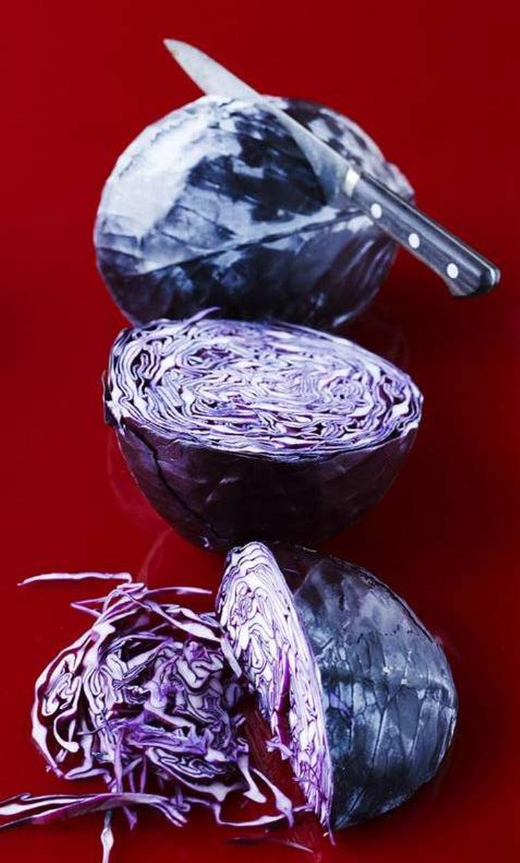 Det er vigtigt, at rødkålen bliver tyndt snittet, ellers er den uspændende at spise med for meget tyggearbejde. Det kræver en skarp kniv, eventuelt en brødsav. Der er mange måder at snitte kålen på. Her er en af dem: