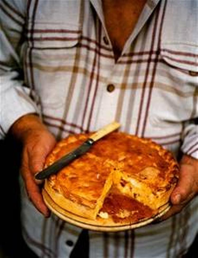 Kom melet i en skål. Rør gæren ud i lidt vand og bland den i melet sammen med æggene, olivenolien, sukker, salt og peber. Ælt dejen igennem, til den er glat, dæk den til og lad den hvile i 30 minutter. Varm ovnen op til 200 grader. Bland alle ingredienserne til fyldet og smag til med salt og peber. Rul 2/3 af dejen ud på et let meldrysset bord og beklæd en cirka 3 cm dyb tærteform med en diameter på 25 cm med den. Fordel fyldet jævnt over dejen. Rul resten af dejen ud til et låg, pensl kanterne med vand og læg det over fyldet. Pres kanterne godt sammen og lav et hul i midten, så dampen kan slippe ud. Bag pien i 30 minutter, dæmp så varmen til 180 grader og bag den i yderligere 15 minutter. Server den varm eller kold.