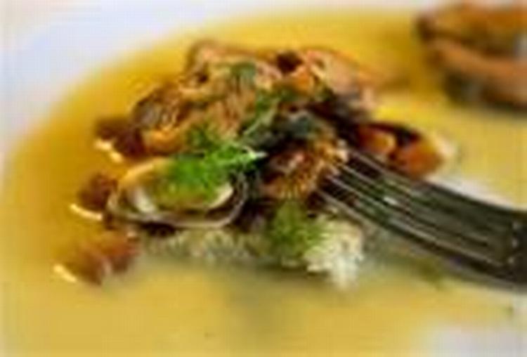 Skær fennikel i små stykker og gem den grønne dildlignende top.Sautér fennikel på panden i lidt smør sammen med 1 finthakket skalotteløg. Når det hele er nogenlunde mørt, smages til med salt og peber, og to tredjedele kommes i blenderen sammen med fløde, æg og mel. Blend til massen er homogen og vend resten af den stegte fennikel i. Steg små pandekager på en blinipande og hold dem varme. Hvis de er svære at få til at hænge sammen, må dejen tilsættes lidt mere mel. Resten af skalotteløgene, hvidløg, porre og persillestilk hakkes og sauteres i lidt olie i en gryde. Kom hvidvin på og lad det koge op. De rensede muslinger kommes ved, der skrues op på fuldt blus, og låg kommes på. Ryst gryden et par gange. Efter 3-4 minutter skulle muslingerne være færdige. Pil muslingerne ud af skallerne og hold dem varme. Si kogelagen over i en mindre gryde og reducer den til cirka 1 dl. Smag til med pernod og pisk resten af smørret i, og nu må sovsen ikke koge længere. Skær brødet i ganske små tern og steg dem i olie med lidt hvidløg, til de er sprøde. Læg en fennikel-blini på hver tallerken, fordel muslingerne ovenpå og kom sovsen ved. Pynt med fennikeltop og små hvidløgscroutoner.