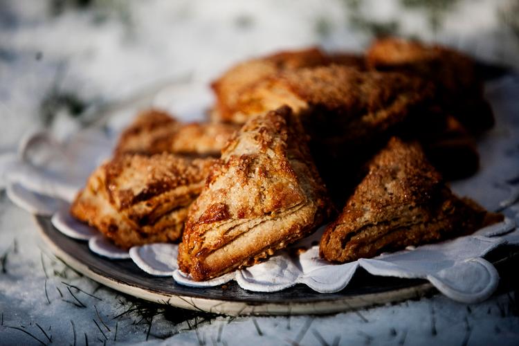 Skær koldt smør ud i 1/2 cm tykke skiver, og læg det adskilt på et stykke bagepapir i fryseren ca. 10 minutter, mens dejen laves.