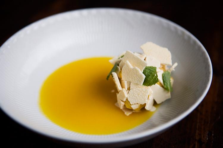 Bred marengsen ud i et tyndt lag på en bageplade og bag den ved 140 i en time. Pak den ned i en lufttæt beholder, så snart den er kølet ned. Hvis dette gøres, mens den endnu er lun, risikerer man, at kondensen vil gøre marengsen blød. Skræl mangoerne og pres dem til juice i en grøntsagspresser. Gem saften fra den ene mango til sauce og brug resten til sorbet.
