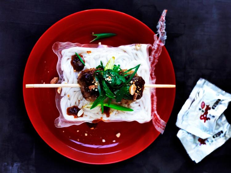 Sådan gør du Rør farsen sammen med løg, fiskesauce og chilipasta. Rør æggene i et ad gangen, lad den trække i 30 minutter. Form farsen i små runde deller/kugler, og steg dem sprøde på en pande i olie i ca. 6-8 minutter. Spid dellerne med spisepinde, og server dem på pindene. Nudlerne koges efter pakkens anvisning, de fleste nudler kan bruges til denne ret. Snit forårsløg og koriander fint, og hak peanuts groft. Vend det sammen til en thaisalat. Anret de sprøde deller på de varme nudler med sataysauce og thaisalaten. Server med lime og ekstra sataysauce Tip : Sataysauce kan købes hos den asiatiske købmand.