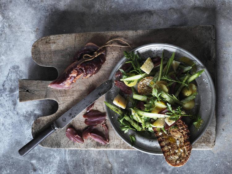 Sådan gør du: Snit asparges fint, pluk persillen i blade, og hak den groft. Skær kartoflerne i skiver, skær osten i små stykker, og bland det hele sammen med olivenolie. Smag til med salt og peber. Skær mørbraden i tynde skiver. Grill brødet hårdt, og gnid det med et hvidløgsfed. Anret salaten på det grillede brød sammen med røget mørbrad, og server med citron skåret i både.