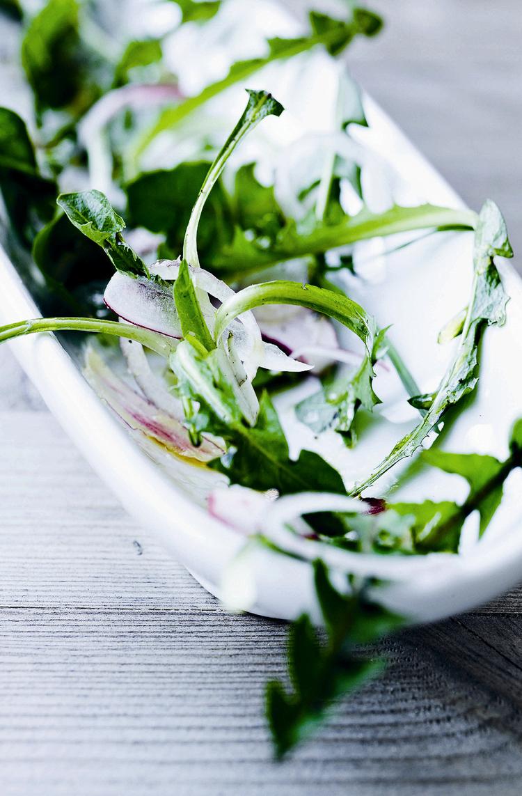 Bland mælkebøtter, rødløg og radiser sammen i en skål, vend med rapsolie og eddike. Krydr med havsalt og friskkværnet peber.
