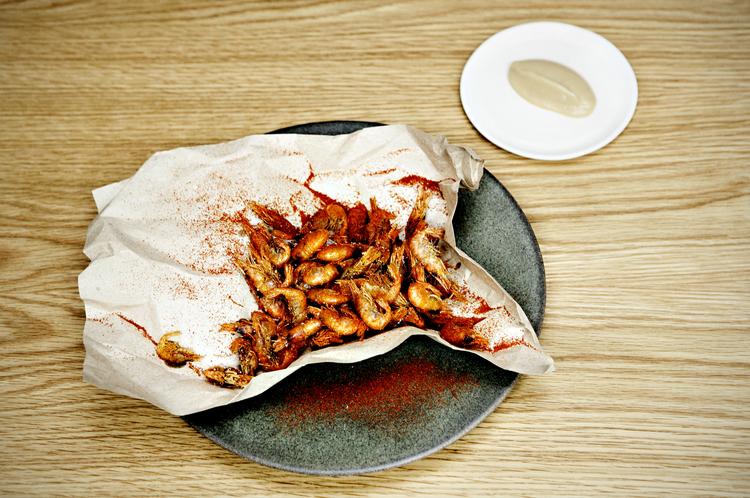 Skær hvidløgene over på tværs, pensl skærefladen med olie, og bag dem med skærefladen nedad i ca. 1 time ved 180 grader, til de er helt karamelliserede i bunden. Lad dem køle lidt ned, når de kommer ud af ovnen, og tryk de bløde og søde fed ud af deres skaller og ned i en skål. Tilsæt lidt salt, og blend det grundigt med en stavblender til en fin puré. Blend olien ned i ligesom til en mayonnaise, og tilsæt vand, hvis den bliver for tyk til, at blenderen kan være med. Smag til med salt og en lille smule citronsaft. Sæt en gryde over med olien til at fritere i. Gryden skal gerne være bred og ikke for høj. Varm olien godt op til 180 grader, og vend rejerne i rugmelet. Det er vigtigt at drysse så meget som muligt af melet af igen. Det kan gøres ved at ruske dem godt i en sigte. Smid dem i olien, og lad dem fritere 40-60 sekunder, til de er sprøde udenpå. Dryp dem godt af på fedtsugende papir, og drys paprikaen over dem. Server med hvidløgsemulsionen til. Alternativt kan man bruge en hvilken som helst mayonnaise, tartarsauce, chipotle, eller hvad man nu kunne ønske sig. Det må bare ikke være alt for sødt. Spises lige straks og med det samme.