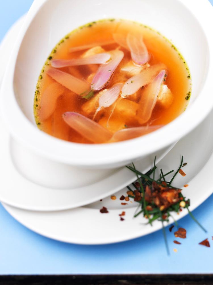 Pisk misoen ud i lidt af suppen i en lille skål. Kog radiserne et halvt minut, eventuelt lidt længere tid. Sluk for suppen, miso må ikke koge, pisk misoen ud i suppen og smag til.