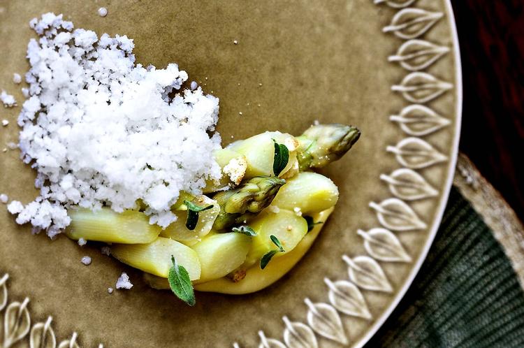 Sådan gør du Skræl aspargesene og skær dem ud i mindre stykker, blancher dem i usaltet vand, indtil de er møre. Cirka 3 minutter. Til dette formål vinder aspargesene ved at blive en lille smule mere møre, end når de optræder i en salt anretning – den sprøde konsistens kan være sværere at acceptere i en sød sammenhæng. Skræl citronerne og pres al saften ud af dem. Bland sukker, skaller, citronsaft og æggene i en gryde og pisk det hele sammen over varmen, til det bliver til en cremet og luftig masse. Sigt cremen, pisk smørret i og køl den ned i køleskabet. Kog vand og sukker op til en sirup, og køl det hele ned igen. Tilsæt kærnemælk og citronsaft og frys det hele i en beholder med en bred overflade. Når granitéen er frossen, skrabes den med en gaffel. Anret citroncremen i bunden, og de kolde asparges ovenpå, pluk små blade mynte ud over retten og drys med kammerjunkerne. Kom den frosne granité ved til sidst.