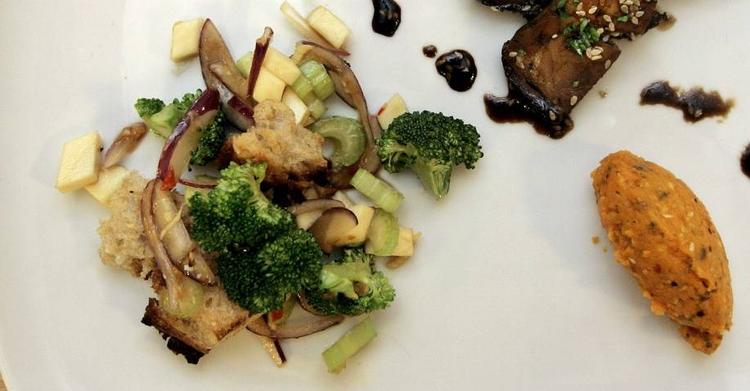 rå grøntsager i tern (f.eks. blomkål og selleri – alt muligt kan bruges) limesaft sød chilisauce sukker sojasauce frisk ingefær brød olivenolie salt hvidløg