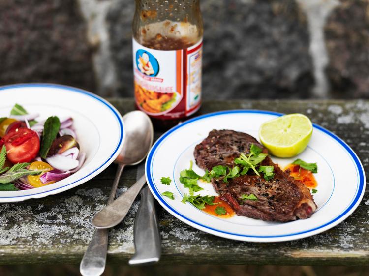 1. Bland alle ingredienserne til limechilidressingen sammen og smag til med sukker og fiskesauce. Hvis du vil have saucen meget stærk, blender du kernerne med. Smagen skal være sød, frisk og stærk. Fiskesauce fremhæver styrken, og sukker stabiliserer den. 2. Skær tomaterne i mindre stykker, snit rødløget fint, snit citrongræsset meget fint og hak mynten groft. Bland salaten forsigtigt sammen med limechilidressingen, og anret salaten på fire tallerkener. 3. Steg bøfferne på en varm pande, krydret med salt og peber, i ca. 2 minutter på hver side. Anret bøfferne med thaisalat og jasminris.