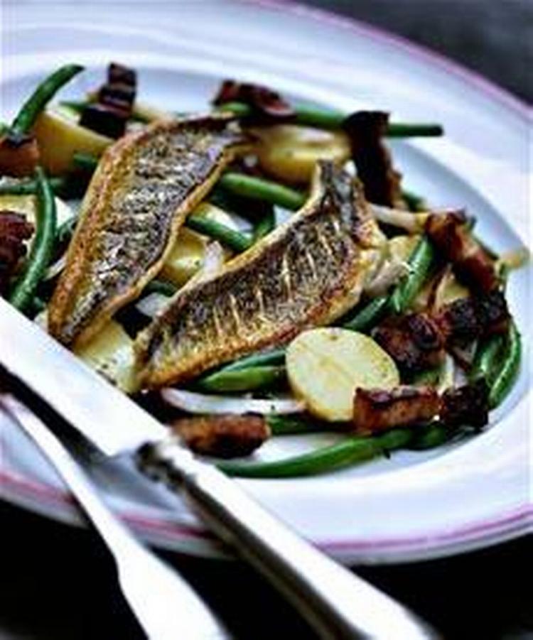 Fordel bønnesalaten på et stort fad eller på fire tallerkener. Drys baconterningerne ovenpå og fordel fjæsingfileterne øverst. Server retten med det samme.