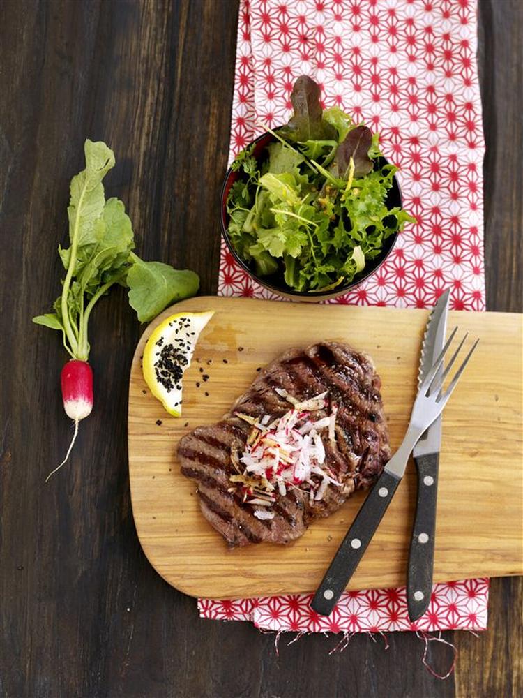 Server dem med 1 tsk. sojasauce på hver bøf og små bunker af revet radise på toppen. Kom resten af radiserne i salaten og vend dressingen i.