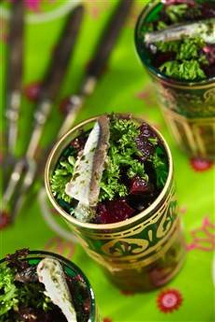 Rødbederne med ansjoser er dejlige som en del af et tapasagtigt arrangement med røget kød, oliven og pølse.