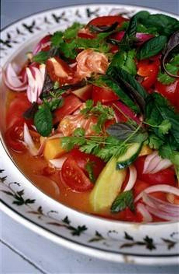 Man kan naturligvis bruge andre grøntsager, som f.eks. avokado, flere tomater, andre meloner, ferskner og nektariner, nye hvidløg, basilikum og andre fisk. Marineringen med lime og salt får fisken til at fremstå hvidlig og fast, og hele arrangementet smager vidunderligt sommerligt. Spis med brød. Hvis man vil have salaten til at mætte mere, kan man komme op til et kilo fisk i, der skal så saltes mere. Sådan gør du Skær laksen ud i tynde stykker. Bland laksen med limesaft og salt. Stil den i køleskabet til marinering, mens salaten tilberedes. Skær alle grøntsager og frugter i smukke stykker, der er til at få ind i munden. Bland det hele med let hånd på et stort fad. Det er lettest at blande, uden at det går i smadder, med nyvaskede hænder. Drys med masser af mynte og frisk koriander.