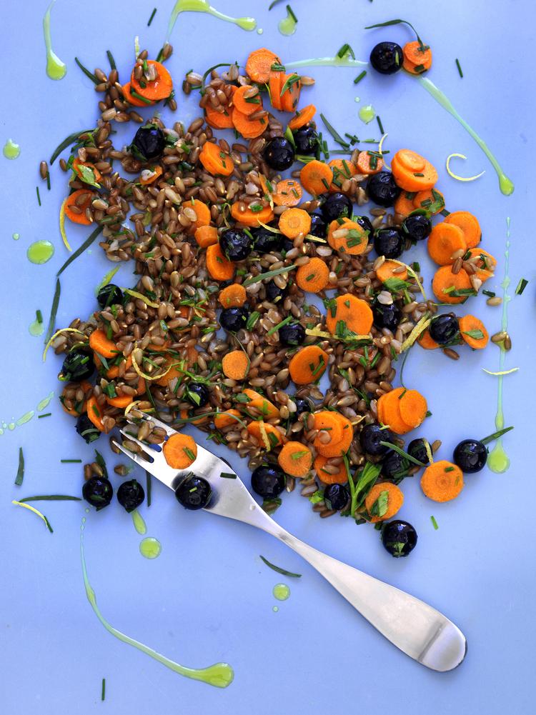 Skrub gulerødderne og snit dem fint. Bland dressingen og bland den i korn, gulerødder og blåbær, smag til. Ved serveringen: Hak estragon og purløg, og bland i.