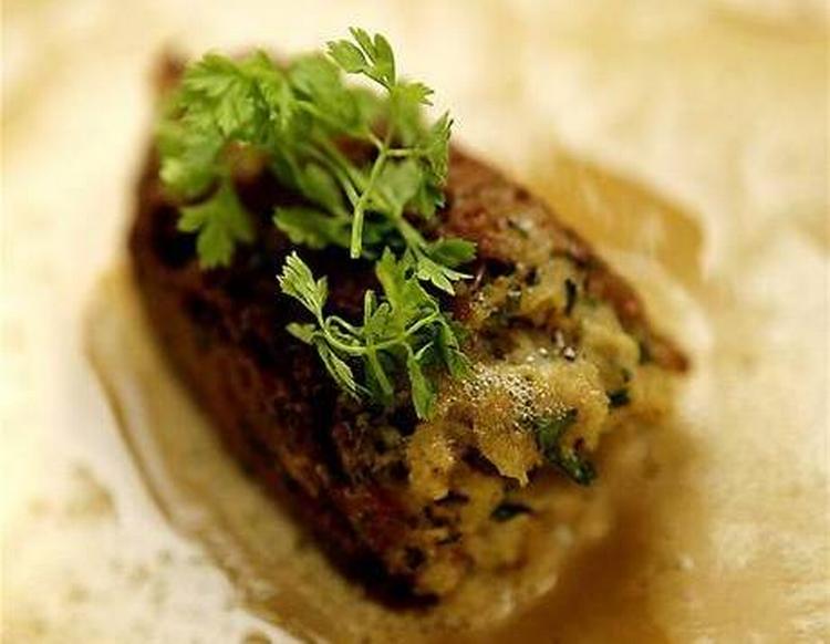 4 kogte taskekrabber (ca. 1/2 kg krabbekød) ca. 40 g rasp 3 spsk. hakkede krydderurter (persille, kørvel, estragon) 1 æg 2 spsk. mayonnaise 1 spsk. citronsaft lidt citronskal et nip cayennepeber et stænk engelsk sovs salt og peber 4 spsk. klaret smør eller olie