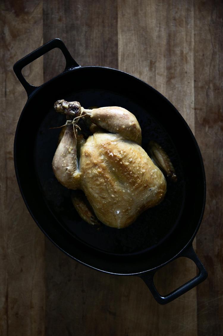 pande eller bradepande, i stål eller støbejern 1,5-kilos kylling salt, peber og olie