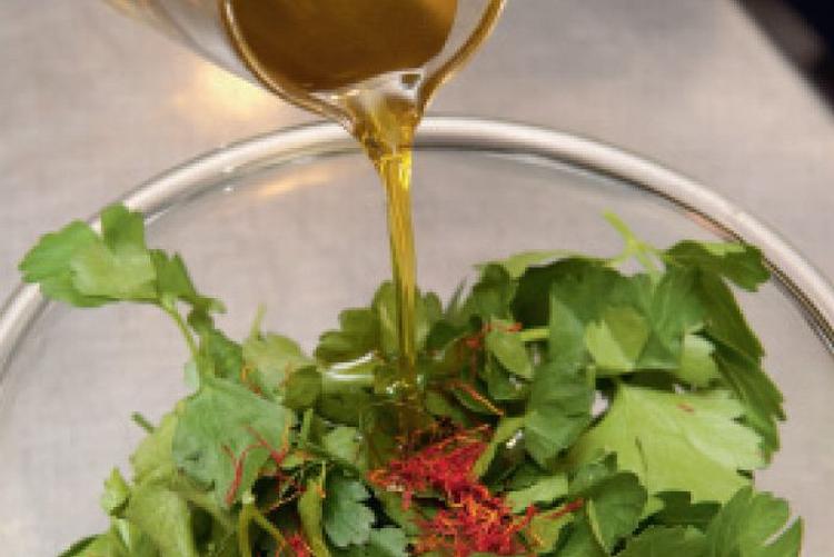Kom de pillede hvidløg og persillebladene i en lille skål og tilsæt de ristede safrantråde og dernæst olivenolien.