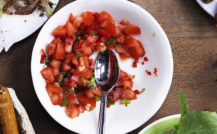 SKÆR tomaterne i små tern på ca. 1/2 x 1/2 cm. Lad dem dryppe af i en sigte, hvis de er meget saftige.