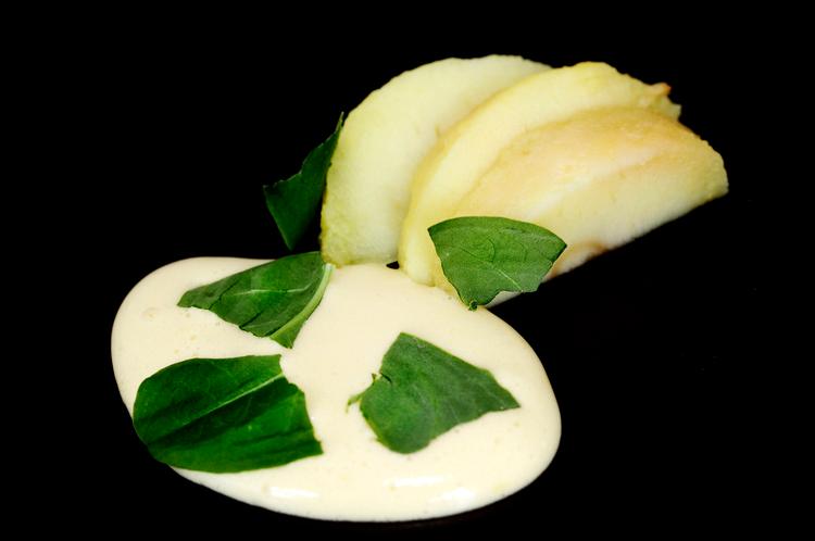 Fjern kernehusene, og del æblerne i to. Læg dem med den flade side nedad på et fad, og bag dem i ovnen ved 180 grader i 15 minutter. Lad æblerne køle af i køleskabet. Bland æggeblommer og flormelis, og pisk det hele sammen på maskine eller med en lille elpisker. Massen skal piskes i mindst 10 minutter, så den bliver helt hvid og luftig. Riv skallen, og pres saften af citronen direkte ned i cremen, og pisk den med i de sidste 2 minutter. Pil derefter forsigtigt skindet af æblerne, og skær dem i både. Anret dem med råcremen og havesyrebladene drysset over.