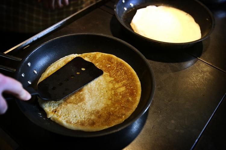 Sådan gør du Lav en lys opbagning af mel og smør. Tilsæt mælken lidt ad gangen, mens der piskes, og lad opbagningen koge igennem. Tag den af ilden og lad den køle af. Rør æggeblommerne i en ad gangen og tilsæt sukkeret. Pisk hviderne stive og vend dem i dejen. Bag 3-4 pandekager af almindelig størrelse. Pas på, at varmen ikke bliver for høj. Læg derpå pandekagerne sammen med hindbærsyltetøjet, som er smagt til med likøren. Drys med flormelis og de hakkede mandler, som først er ristet gyldne på en pande. Den russiske pandekage serveres lunken og skæres ud som en lagkage. En lille kugle god vaniljeis vil sikkert ikke skade den.